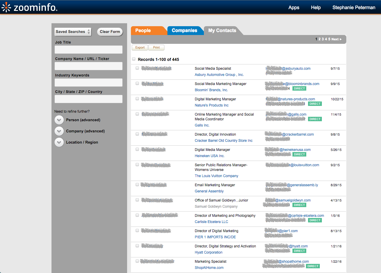 ZoomInfo aggregates all unlocked contacts into one long list that can be exported and uploaded to your marketing automation or CRM/sales platform.