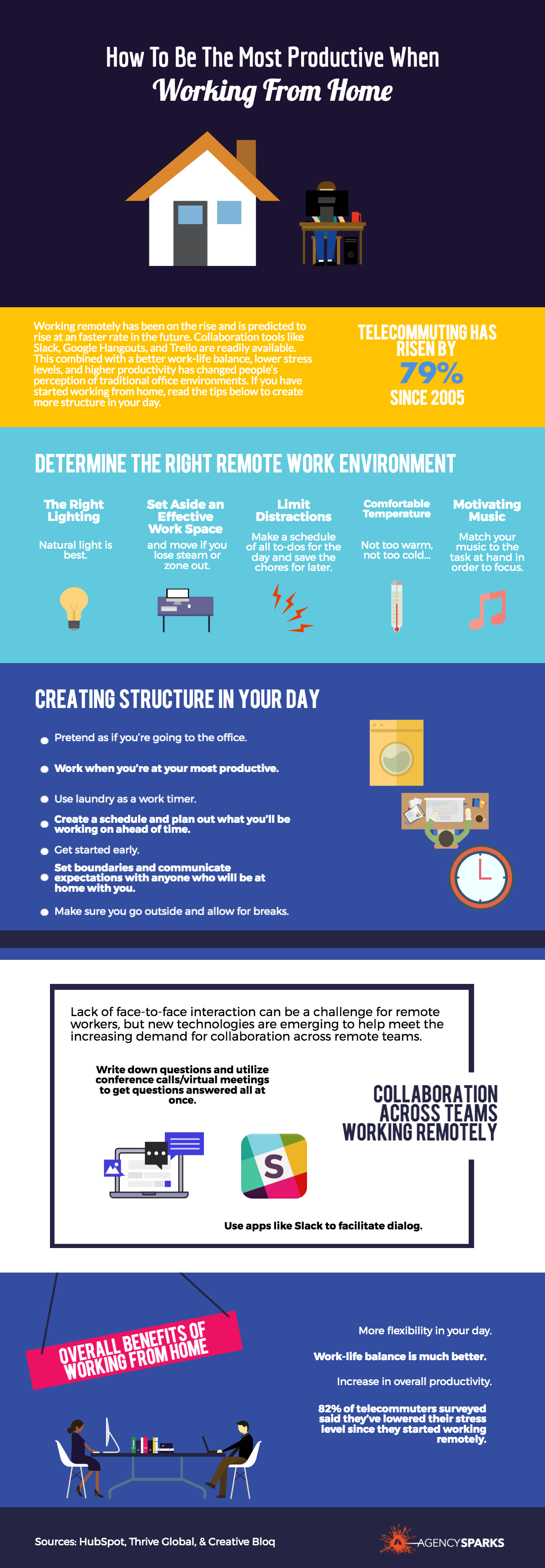Thinking about working from home, or already are, and looking at how to be the most productive and have more structure in your day? Working remotely has been on the rise and is predicted to rise at an faster rate in the future. Telecommuting has risen by 79% since 2005. A better work-life balance, lower stress levels, and higher productivity has changed people’s perception of traditional office environments. Check out this infographic for steps to determine the right remote work environment, create structure in your day, collaborate across teams, and the overall benefits of working from home.